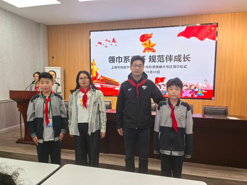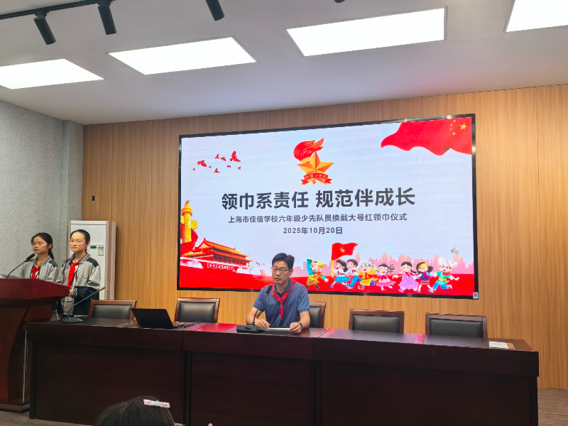 10月20日,伴随着雄壮的《出旗曲》,上海市佳信学校六年级“换戴大号红领巾”仪式正式拉开帷幕。本次活动由八(1)中队冯诗雨、杜美逸主持,六年级全体队员、中队辅导员及校领导共同参与,现场庄严而温暖。