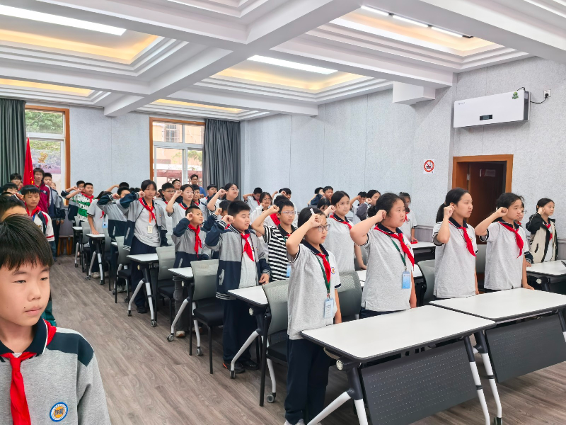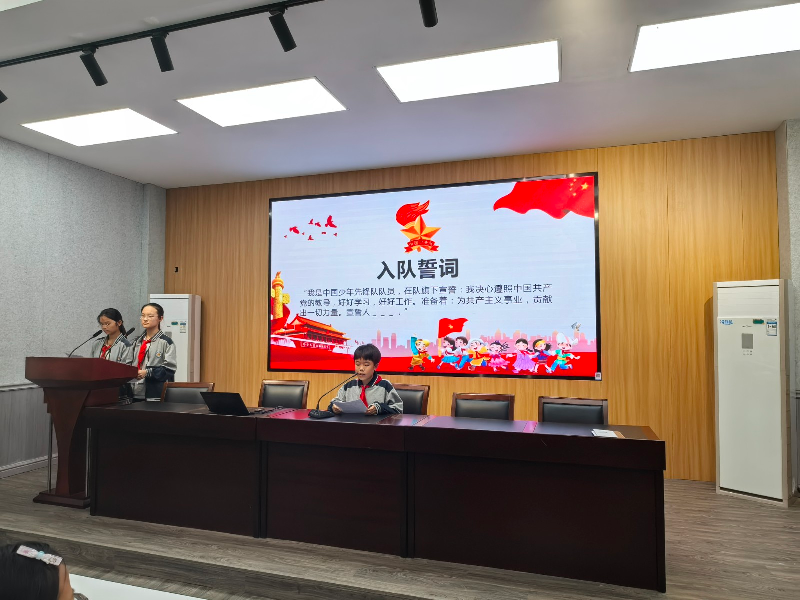 “小红领巾,是您带我们跨入中学的门槛;今天,您虽然离开胸膛,却永驻心房。”队员代表六(1)中队夏东辰同学的发言表达了对过去的眷恋,更憧憬着未来。紧接着,冯诗雨同学带领全体队员重温入队誓词:“……为共产主义事业贡献力量!”铿锵誓言响彻会场,也把仪式推向高潮。